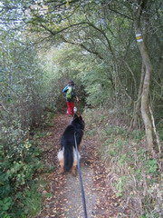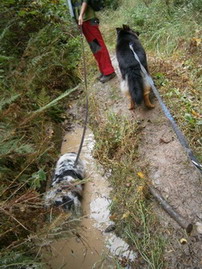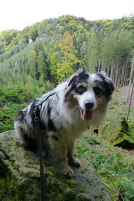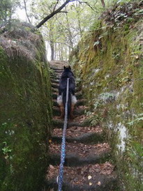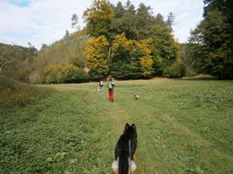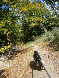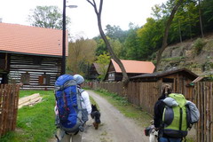 Páteční ráno slibuje slušné počasí. Kazi dostává párek od vydatné snídaně, rychle se opásáme, nahodím 60-ti litrovou krosnu, protože do plánovaného 35-ti L batohu se mi výbava bohužel nevešla a v 7:38 vyrážíme. Již po několika prvních metrech cítím, že mi sjíždí nový neodzkoušený opasek se spodním tahem. Sakryš, doma před zrcadlem seděl :))))) První kilometry tedy strávím přidržováním sedáku jednou rukou, aby mi nespadl až ke kolenům, druhou rukou brzdím tahouna psa na prudkých schodech a sestupech v pískovcových skalách a špatně vyvážená krosna se naklání na stranu. Roklí Kočičina mě pes vleče po bahnité kluzké cestičce a já poprvé sedím na zemi :o Jakmile se ocitáme na silnici, seřizuji správně opasek, vyvažuji krosnu a už propocená sundávám bundu.