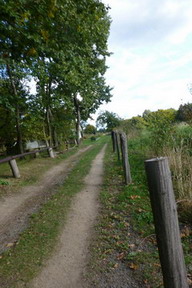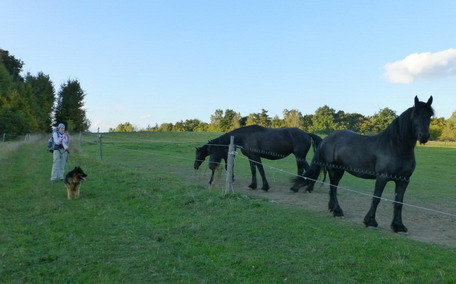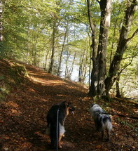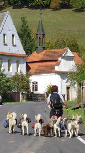 Následující úsek je pro mě jeden z nejhezčích - travnatá cesta rozlehlým údolím mezi zajímavými pískovcovými útvary, sluníčko nám hřeje do zad a povídáme si s paničkou neúnavné seveřanské kříženky Sali. Ta brzy zjišťuje, že ztratila mapu i s itinerářem a startovní kartičkou - stát se to mě, tak mě klepne. Zatímco jí hlídáme baťoh, přelepuji první stržený puchýř, pálí jak čert. Za námi jdoucí trekaři mapu našli, takže naštěstí nemusí daleko.