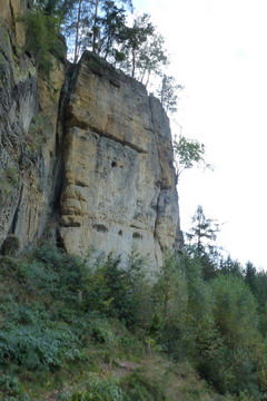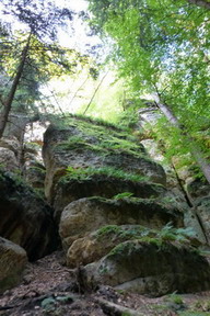 Sestup do Kokořínského dolu a opět funíme do prudkého kopce ke skalnímu hradu Nedamy, avízovaný Kokořín nevidím, jsem ráda, že popadám dech. Hezká stezka bučinami po úpatí kopce až do Šemanovického dolu, na jedné straně stále prudké srázy, takže cesta přes kořeny je náročná.