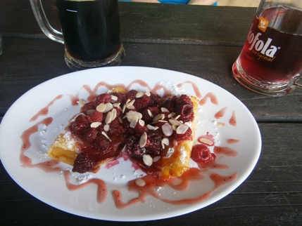 Nedělní ráno si dám pořádnou snídani na terase restaurace, kdy většina snídá uvnitř, já mám jako vždycky nějakou dobu po treku potřebu být venku na vzduchu a uzavřený prostor mi doslova vadí. Chvíli pak sedíme a povídáme, ale já musím do vyhlášení výsledků o desáté dopoledne ještě nutně zabalit ...