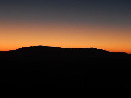Východ je najednou velice rychlý, nacvakám co zvládnu, slezu za trpělivým psiskem šílejícím radostí, dostanu do sebe trochu čaje a dáváme se na zpáteční cestu. Celkem brzy se ale rozhýbu a rozehřeju, až mě napadne, jestli se na vrchol nevrátit, rozhled teď musí stát za to ... pak na to ale kašlu a seskakuji po kamenech za psiskem. Na odpočívadle na hlavní cestě dáme pauzu na čaj a moji dnešní druhou snídani. Brzy nás dochází mladý pár se kterým jsme také nahoře na východ čekali a moje hladové psisko má štěstí, protože na rozdíl ode mě neodolají jeho výrazu "dobrota mu kouká z očí" a dělí se s ním o snídani :) Míjí nás čtvrtý nadšenec, s úsměvem nám přeje příjemný den a zažíváme přitom zvláštní pocit spojitosti z dnešního nevšedního zážitku ...