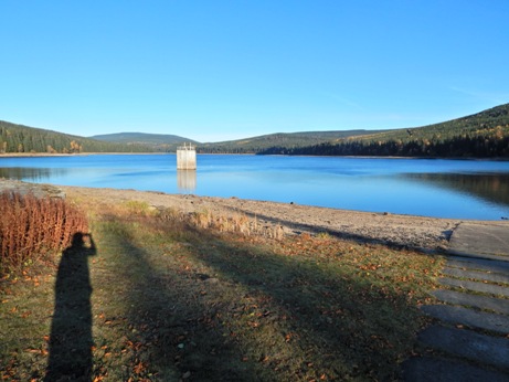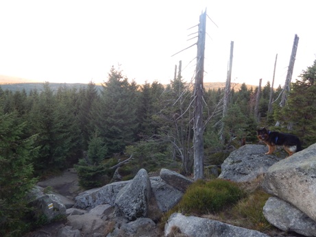 Po osmé ranní jsme zpátky na Smědavě a zatímco přijíždějí první návštěvníci, my s psiskem odjíždíme už s pořádnou "ranní procházkou" v nohách. Zastavíme se ještě u soušské přehrady s výhledem právě na vrchol Jizery, kde jsme před pár hodinami byli a udělám psisku pár fotek, dokud nejsme ze "zakázaného území" vykázáni ...
